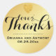 Glowing gold background with black lettering creates a classic wedding thank you sticker. Decorative typography makes a stylish statement of love and thanks. A small gold foil heart photo embellishes the top of the wedding sticker. The bride and groom names and their wedding date completes the sticker than can be used to seal wedding favour bags, wedding cake boxes and thank you notes. Perfect for a gold wedding for formal wedding.