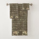 On this stylish towel set is a brown backdrop are gold hieroglyphs with a brown band in the middle with a gold repeated egyptian eye of ra creating chic mysterious vibes.