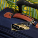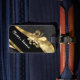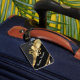 Gold fleur de lys on black luggage tag