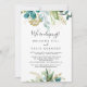 This gold floral tropical green elopement reception card is perfect for a destination post elopement party. The design features predominantly hand-painted watercolor green foliage coupled with gold flowers, adorning an elegant geometric frame.