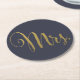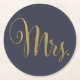 cute navy blue coasters with elegant faux gold foil scripted lettering showing the word Mrs on the front. Matching coasters with the word Mr available here.