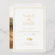 This elegant and stylish wedding save-the-date announcement invitation features simple text, and beautiful leaves printed in real gold foil. The back includes an engagement photo for personalizing.