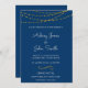 Gold Foil String Lights and Handwritten Script Navy Blue Elegant Wedding Invitation Card.