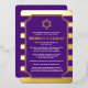 This fully customizable Bat Mitzvah invitation has a real gold foil striped border on a purple background with the name of the Bat Mitzvah in gold foil, too, along with a Star of David at the top. The rest of the wording is white and carries over to the backside where reception or party details can be printed, while the front side contains RSVP details, making this a luxurious all-in-one Bat Mitzvah invitation with a lot of bang for your buck. You can also select silver or rose gold foil colours and you can change the colour of the purple background to whatever colour you want using the "edit using design tool" mode. If you need assistance to add a Hebrew name, email niteowlstudio@gmail.com.