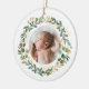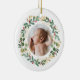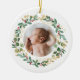 Elegant, modern and pretty baby photo Christmas ornament. This template featuring a floral wreath with gold & green foliage and red berries. Revere to reveal an adorable illustration of Blue baby dinosaur sleeping under the gold yellow stars with custom Baby's name. Great for both baby boy and girl. Perfect gift for all seasons!