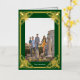 Your photo and family name decorated with a fancy gold frame on a pine forest green background. The background has green and gold diagonal stripes with gold holly. Photo Credit: Photography © Storytree Studios, Stanford, CA