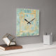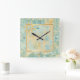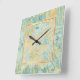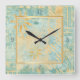 Here's a very unique and pretty abstract design kitchen clock in colours of gold and teal. Modern abstract design collides with a bit of retro to make it truly one of a kind. Dark silver grey numbers at the twelve, three, six and nine positions make it easy to read. And a shiny gold square frame adds extra interest. A bright, modern addition to any room!