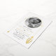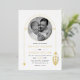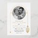 This refined wedding invitation features exquisite gold foil details and the couple’s photo against a white background. The photo and text are displayed in a frame that resembles delicate wire jewellery, with a leaf detail on one side and an arrow on the other. The back of the invitation has a diagonal pattern of the couple’s names in gold on white for added sophistication. The cover has been designed using assets from Freepik.com