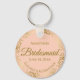 These keychains are designed to give as favours to bridesmaids in your wedding party. They feature a simple yet elegant design with a pale coral peach or light orange coloured background, gold script lettering, and a lacy golden faux foil floral border. The text says "Bridesmaid" with space for her name, the names of the couple, and the wedding date. Perfect way to thank your bridesmaids for being a part of your special day!