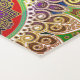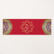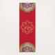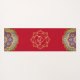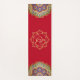 Indian inspired yoga mat done in red, with a gold tone decorative Ganesha, in the middle. Graphics of colourful mandalas decorate both ends of the mat. Same design is featured on both the front and backside of the mat.