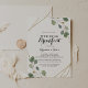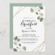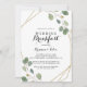 This gold geometric calligraphy wedding breakfast invitation is perfect for a rustic day after the wedding friends and family get together breakfast. The design features hand-drawn botanical green eucalyptus branches and leaves adorning an elegant frame.
