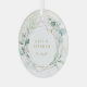 Modern and elegant ornament featuring your names and wedding date inside of a faux gold geometric frame surrounded by green eucalyptus leaves and greenery with a hint of blue, over a pastel watercolor wash with speckles of faux gold glitter. This rustic, botanical ornament also makes a great gift for a newlywed couple for their first Christmas.