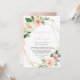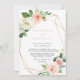 Compliment your classic wedding event with this gold geometric fall flowers back and front wedding invitation. The design features pink, white watercolor flowers with green leaves, adorning a gold geometric frame.