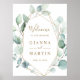 This wedding welcome sign features painted watercolor eucalyptus and botanical green leaves with a gold geometric frame. For more advanced customization of this design, please click Customize Further link to change font, size, and colour.