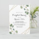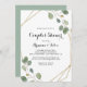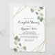 This gold geometric modern calligraphy couples shower invitation is perfect for a rustic wedding shower. The design features hand-drawn botanical green eucalyptus branches and leaves adorning an elegant frame.