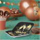 New Year's eve party paper plates featuring champagne glass toast, fireworks, and balloons on a black background. Festive and cheerful.