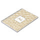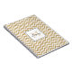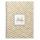 Personalized spiral notebook features elegant gold glitter chevron pattern with custom name in black handwriting font and monogram in matching gold shade in white square frame.