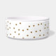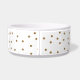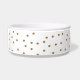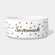 Stylish white ceramic pet food / water bowl, with graphics of golden glittery polka dots. Personalize the black script text for your pet or as a great gift idea for any pet owner.