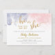 Ce genre horizontal révèle l'invitation de la fête comporte un texte de calligraphie de parties scintillant d'or sur un arrière - plan d'aquarelle rose et bleu foncé. Personnalisez cette invitation ludique et moderne avec votre sexe révéler l'information de la fête.
