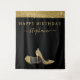 Elegant and Chic Modern Gold and Black Happy Birthday Photo Backdrop Selfie Background Tapestry Banner with Faux Glitter Yellow Gold High Heel Stiletto Shoes and personalized calligraphy script signature.