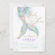 The back of the invitation features a beautiful pattern of mermaid scales in soft pastel colours, accented with shimmering gold, adding a touch of elegance and whimsy to the overall design