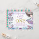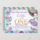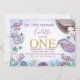 Cute mermaid themed first birthday invitation for a little girl featuring a lovely mermaid and various under the sea creates such as a narwhal and sea turtle. The design also features a removable faux gold glitter text image. This mermaid themed birthday party invitation is ideal for a little girl's mermaid themed birthday party.