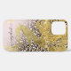 "Gold Glitter Foil Pink with Chic Leopard Print Script Name iPhone 12 Case." Elegant Leopard animal print glam for a girly girl! Gold foil streaks with glitter shimmery sparkles over a simple white background. Design copyright, Audrey Jeanne Roberts.