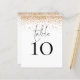 A size 4.5 x 5.6” semi-gloss 110lbs weight, which is of similar thickness to a postcard, with ONE per sheet. Gold Glitter Script Wedding Table Number. An elegant design with table in a set handwriting style script and your table number beneath. Easily personalise the number. A silver faux glitter border runs along the top edge. The same design is on the other side.