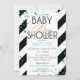 Bold black and white stripe with tossed gold glitter and turquoise sprinkles modern baby shower invitation cards.