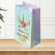 Amaze your guests with this cute unicorn theme birthday party gift bags featuring a beautiful gold unicorn face and pretty flowers with modern typography on a pastel rainbow gradient background.