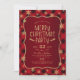 Cute Merry Christmas party invitation features a red festive plaid background, gold glittery snowflakes, a gold glittery typography and tree leaves.