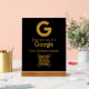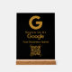 Encourage customer feedback with this elegant gold and black acrylic sign. Featuring a prominent Google logo, a 'Review Us On Google' prompt, and a scannable QR code, this sign makes it effortless for patrons to share their experiences. The customizable space for 'Your Business Name' ensures seamless branding. This sleek and modern sign is perfect for any business looking to boost its online reputation and gather valuable insights. Its sophisticated design complements any decor, making it a stylish addition to your counter or reception area.