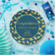 Blue and gold school colours, gold graduation caps thrown in the air for both him and her. Nice graduation party paper plates for a grad party, for a graduate from a high school, college, or university with school colours of blue and gold. Personalize with graduation year, name of the graduate, and the name of the school.