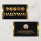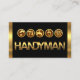 An all black cover is encapsulated by a pair of gold layers on the left and right sides of the card. Over at the top lies an array of gold handyman icons which can represent some of the services that you offer e.g. the drill-measuring tape can mean carpentry-home repairs etc. The gold business name "HANDYMAN" signage is at the base.