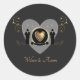 Sticker with a design of two grooms, standing on either side of a gold heart. This item is part of a wedding set that includes a wedding invitation, rsvp card, and more. (The gold elements in the set are faux gold and not gold foil.)