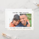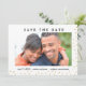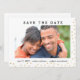 A very sweet and romantic save the date card features your couple's photo surrounded by tiny gold hearts. On the front the hearts are placed in the right and bottom margin. Save the Date is written across the top of the picture. One of line of text along the bottom of your picture allows you to personalize your message. Congrats on your wedding!