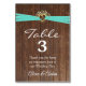 Aqua ribbon in heart with baby's breath bouquet on rustic brown barn wood for table number tent.