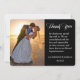 Your photograph is located on the left side of this horizontal photo template wedding thank you card. The right side has the text "Thank You" written in a pretty script in white, followed by your own special message. Your custom signature and wedding date is at the lower right. The back of the invitation is dramatic black with a pretty gold hearts pattern. Modern, very personal, and trendy!