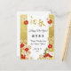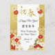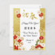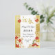 The Japanese reads "sho-shun" that is a popular new year's greeting phrase and that means early spring in English. The red, gold and white flowers are cherry blossoms, plum blossoms and mums with Japanese patterns call KIkou in gold in a gradient of god and Unryu patterns in the background. All the black texts in front and back are customizable. This is a digital illustration.