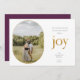 Que votre saison des fêtes soit remplie de joie. Cadre photo simple arrondi en feuille d'or avec lettrage de joie en fausse feuille d'or, carte de vacances. Le dos de la carte est de couleur violet foncé.