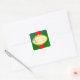 This custom sticker has a beveled gold frame on a red ribbon on a holiday theme forest green background with a blue and green pine pattern created from a vintage etching. Add your own personal message to this sticker!
