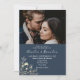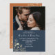 Romantic, elegant terracotta and navy blue wedding invitation with gilded gold floral lace and photo of the couple.
