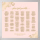 This beautiful wedding seating chart features gold text on a pale blush pink coloured background with seating assignments for up to 250 guests. It features a simple yet stylish and elegant design with ornate decorative faux foil golden filigree in the corners. The title is written in fancy script calligraphy and reads: Please find your table.