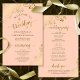 These wedding programs are elegant and tasteful, while still being budget friendly. The design features ornate golden faux foil lace with gold text on a coral peach colored background. The typography features lacy script calligraphy, and there is room for details on the ceremony, the bridal party, and a short thank you.