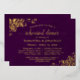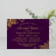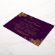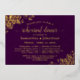This beautiful rehearsal dinner invitation features an elegant design with gold foil printing on a deep plum purple background. The design features fancy script calligraphy with golden lace curls and swirls in the corners. There is space for information on both the wedding rehearsal and the dinner. Wonderful way to thank the bridal party while making sure they have all of the info they need.
