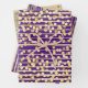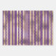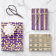 A trio of gift wrap, each with a different design on it but all in gold and a beautiful lapis purple. The first sheet has thin horizontal lines over which vibrant gold confetti dots appear; the second has a vertical thick and thin stripe in-between which is a delicate vertical stripe with beads and the third has thin horizontal stripes threading through medium size gold circles in antique gold. The background colour may be changed to any of your choice.