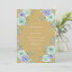 This design features a rich gold backdrop adorned with lush watercolor roses in soft lavender and mint green hues. Delicately painted eucalyptus leaves and botanical sprigs accent the layout, creating a refined and elegant aesthetic. The artwork balances warm metallic tones with cool-toned floral elements for a romantic atmosphere.