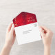 This pretty all season wedding invitation with tear away RSVP card in tones of gold and vivid red will give a sense of elegance to your wedding! The inside has a graceful gold swirl adorned with a few leaves, and there's a subtle gold confetti overlay to add a bit of sparkle. Your wedding text is in pale gold at the right of the leaf swirl image. Everything is placed on a stunning red gradient background that seems to almost glow. The bottom tear away RSVP portion has the swirl image continued, but is white to make it easy for your respondent to mark. If you don't need a text field, just blank it out, and if you need help organizing different text, please contact us. We are always happy to help. If you're having a buffet reception, we can work with you to re-design the RSVP portion, so don't hesitate to ask! An added bonus and personal touch is your own photograph on the back flap.