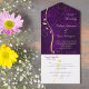 This pretty all season wedding invitation with tear away RSVP card in tones of gold and purple will give a sense of elegance to your wedding! The inside has a graceful gold swirl adorned with a few leaves, and there's a subtle gold confetti overlay to add a bit of sparkle. Your wedding text is in pale gold at the right of the leaf swirl image. Everything is placed on a stunning deep purple gradient background that seems to almost glow. The bottom tear away RSVP portion has the swirl image continued, but is white to make it easy for your respondent to mark. If you don't need a text field, just blank it out, and if you need help organizing different text, please contact us. We are always happy to help. If you're having a buffet reception, we can work with you to re-design the RSVP portion, so don't hesitate to ask! An added bonus and personal touch is your own photograph on the back flap.