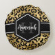 Chic gold and black leopard print round pillow with a custom name and monogram template. A cute and trendy safari animal print pattern background topped with your own bit of personalization.